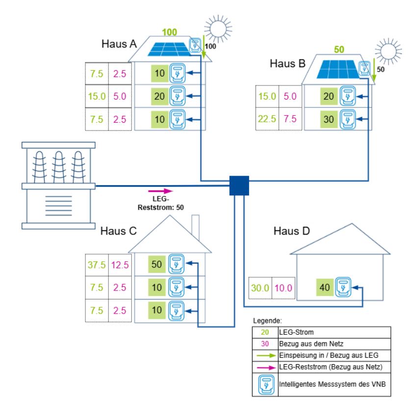 Der Solarstromverbrauch wird gemäß dem Verhältnis zwischen Gesamtproduktion des LEG und Gesamtverbrauch des LEG, das viertelstündlich nach den von der Branche festgelegten Regeln berechnet wird, gleichmäßig auf die Mitglieder verteilt (siehe Beispiel unten):